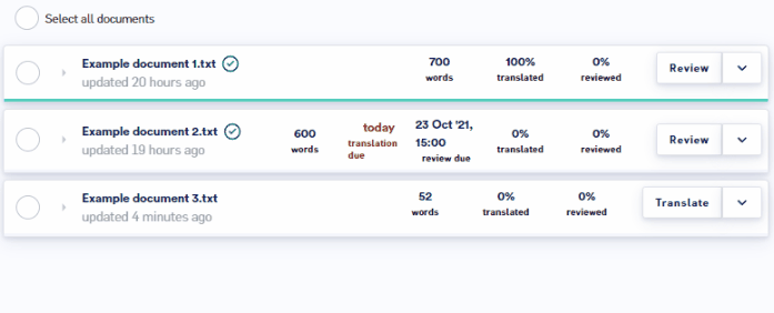 When one or more Document cards is selected, click thePretranslate button to Instant Translate all the documents using the Data Source associated with the project.