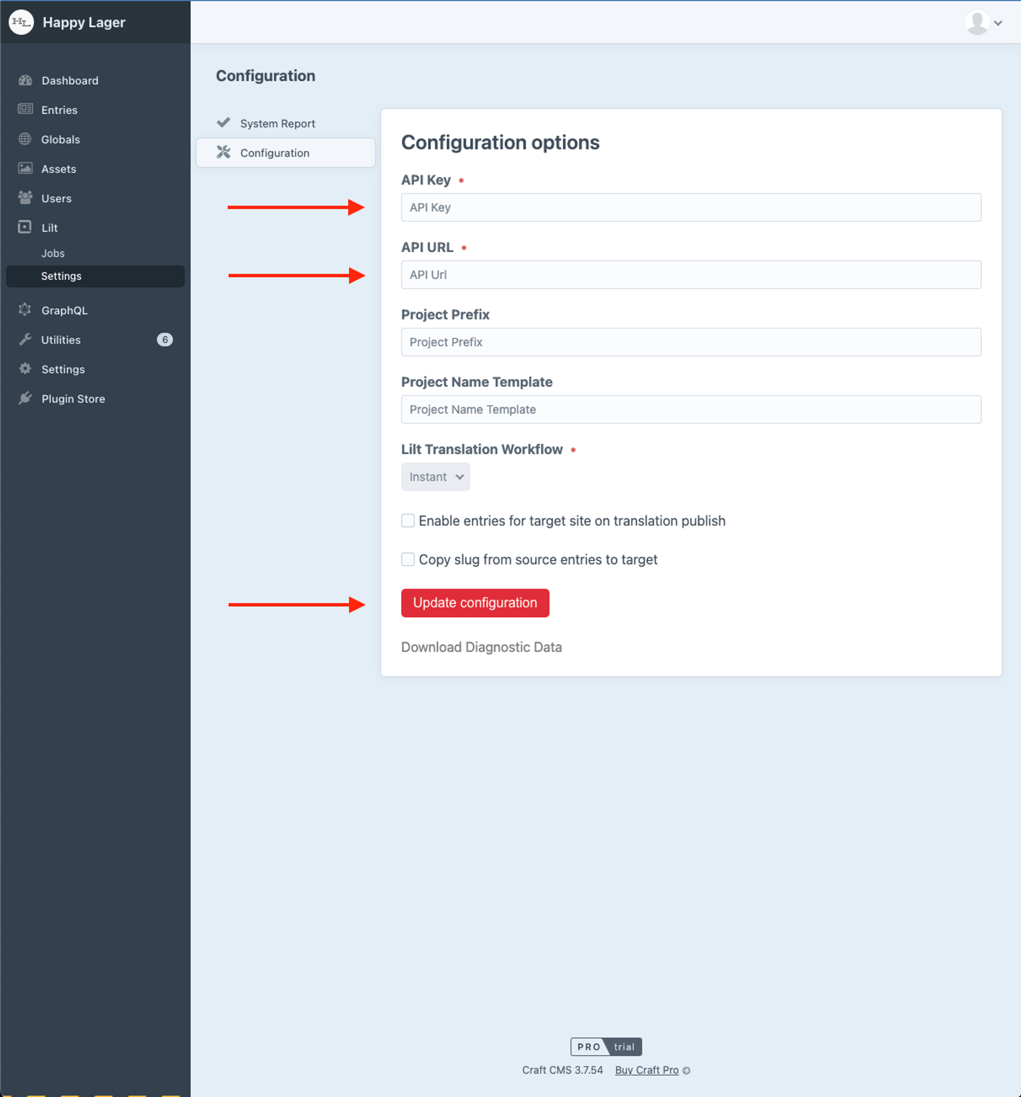 In the LILT plugin settings, you will find two important settings: API Key and API URL.