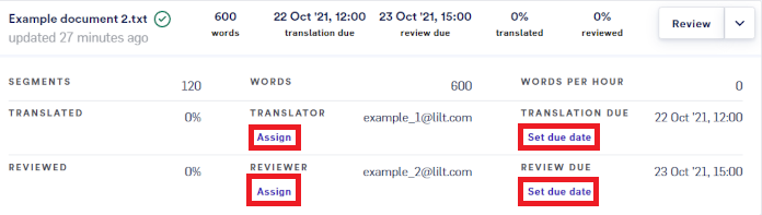 Review button (or click the Document name) to open the document into LILT Translate in Review mode.