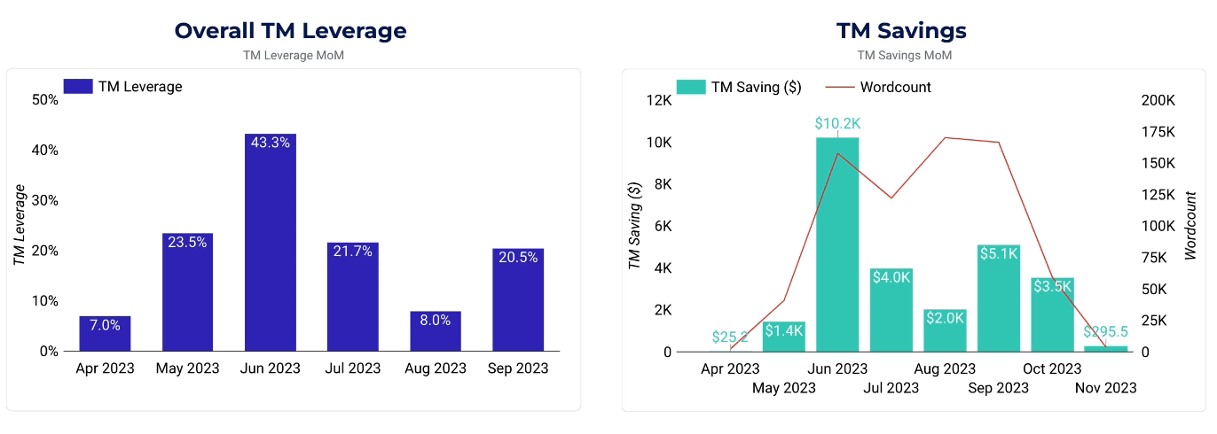 - Shows the % of incoming source words where leverage was used. Demonstrating the value of your language assets.