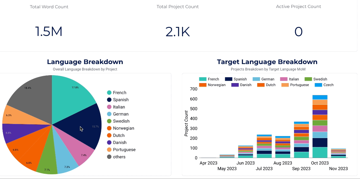- Target Language Breakdown, number of monthly projects per target language pair