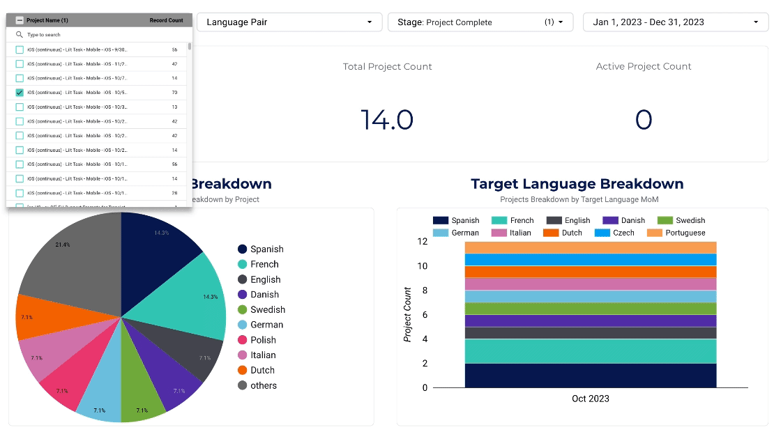 Select projects, language pairs, project stage, or time ranges to slice displayed data. Use icon in top left to restore defaults