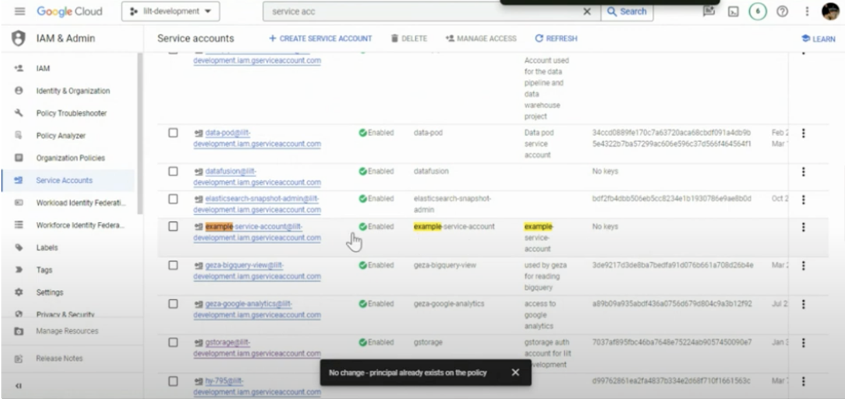 - Type Service accounts into search bar and select “Service accounts IAM & Admin”