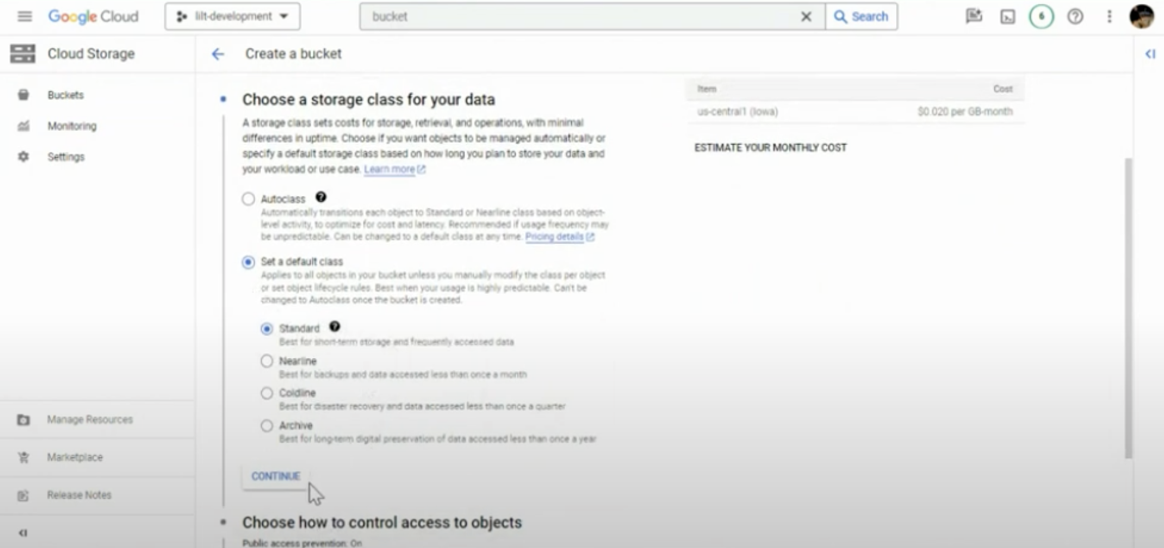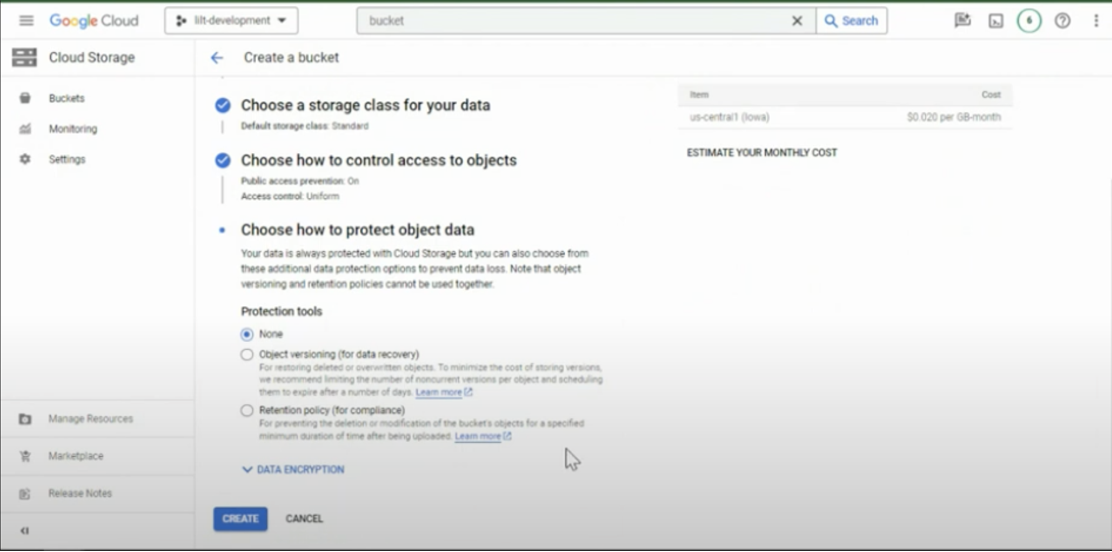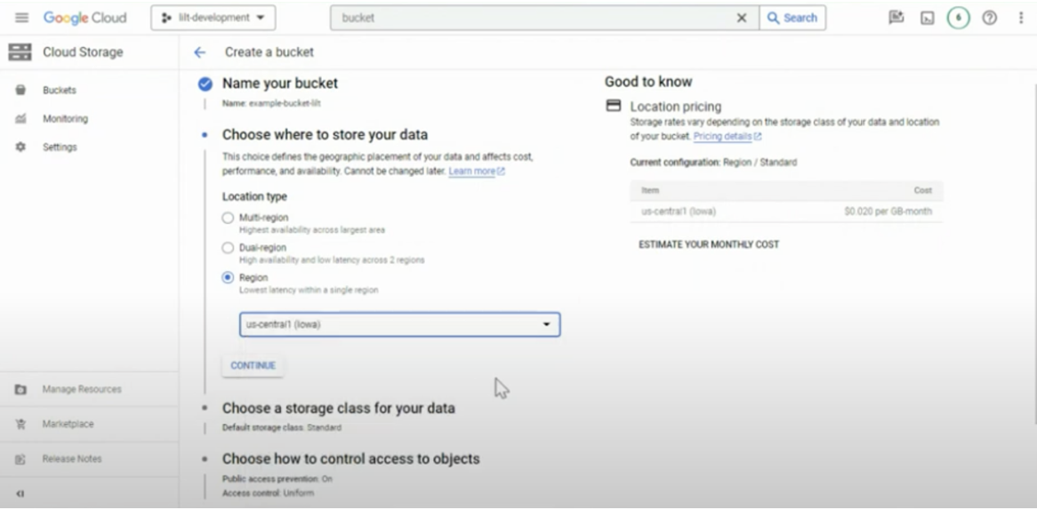 - Bucket with Location =US-Central1, and Storage class = standard class.