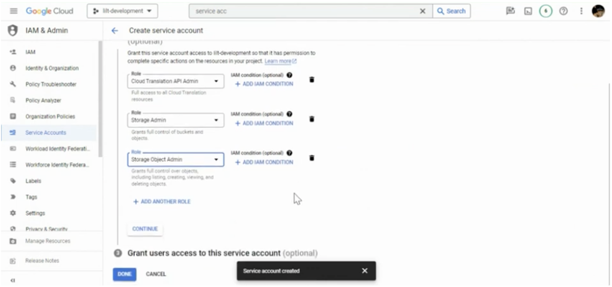 The first step when helping a customer set-up GCP credentials is to ask their IT department if they have:- Service account keys with Cloud translation API Admin, Storage admin, and Storage object admin permissions