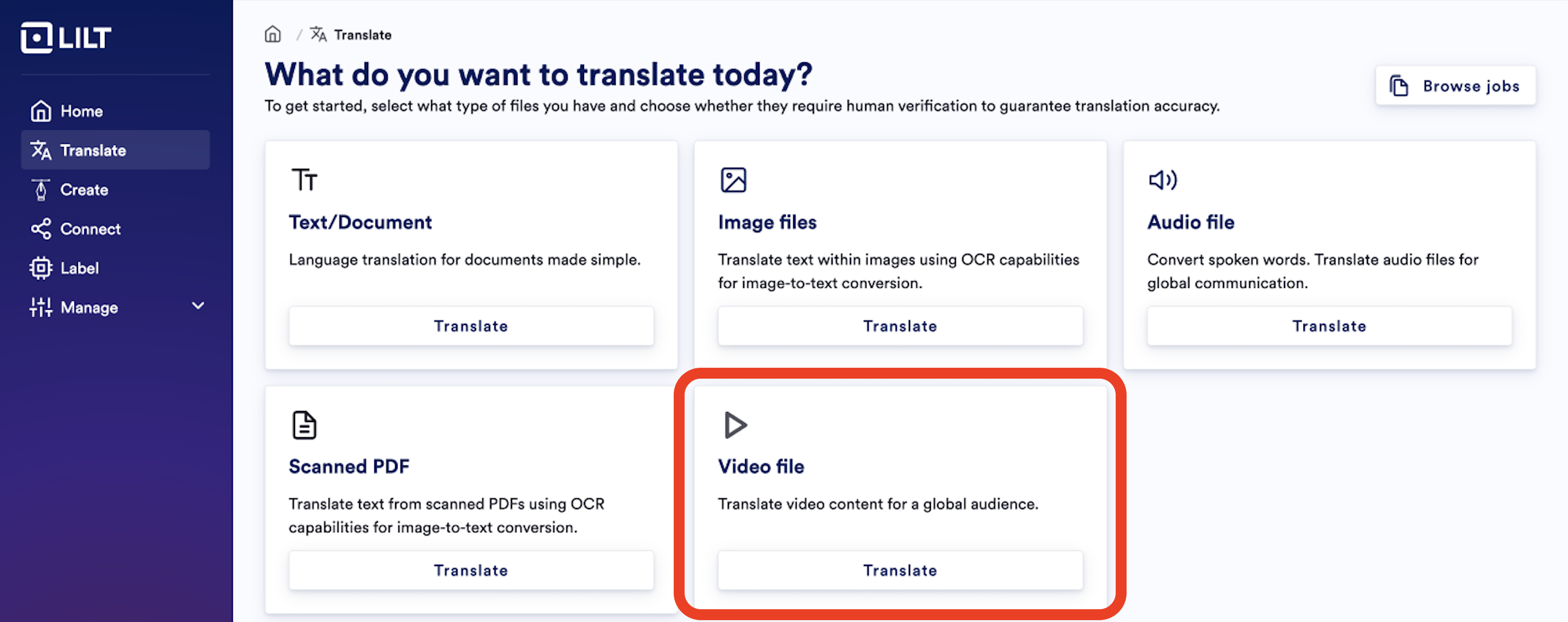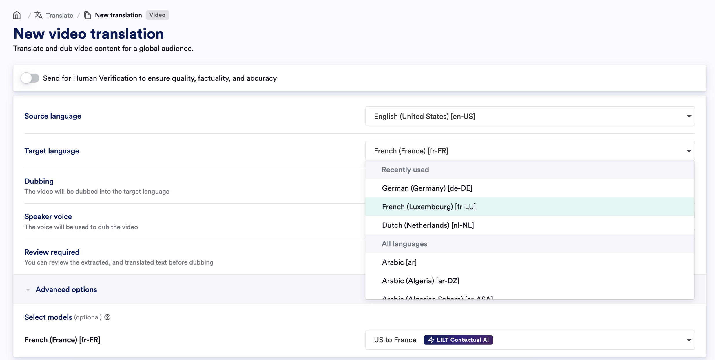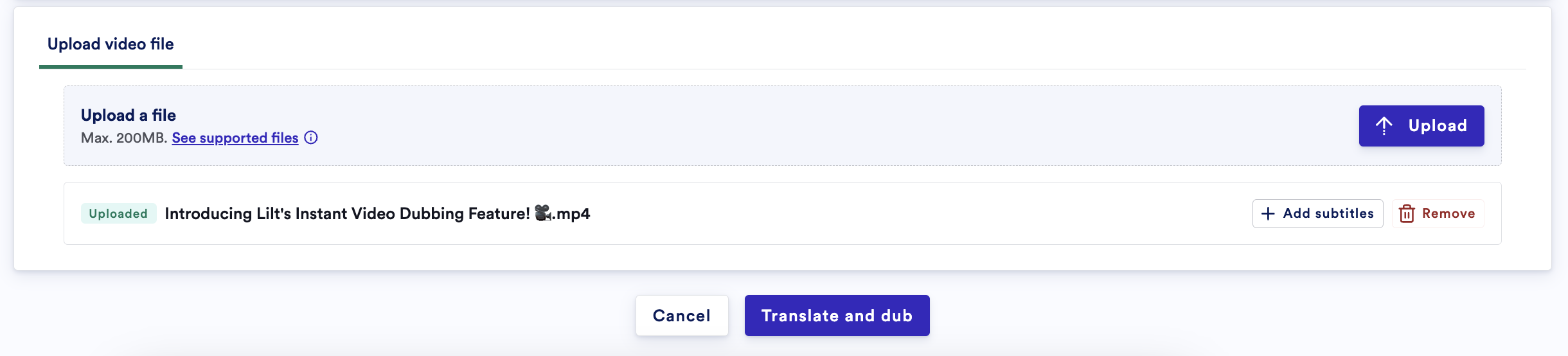 Upload your video file. You can also optionally add a subtitle file, which will bypass the text extraction step. If you don’t add a subtitle file, LILT will extract text to be translated and dubbed. Click on “Translate and dub”.