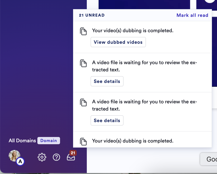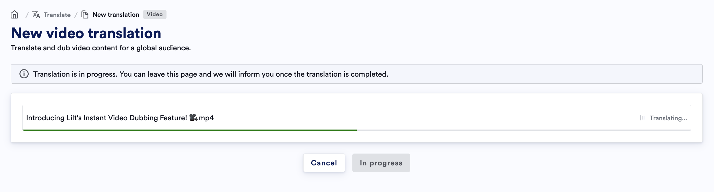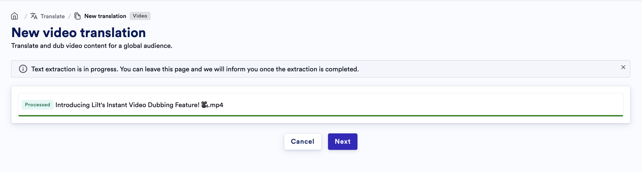 At any point during the text extraction, instant translation, or dubbing, you can leave the instant video dubbing screen. Progress notifications will appear in your notification tray when the step completes and you can access the in progress project.