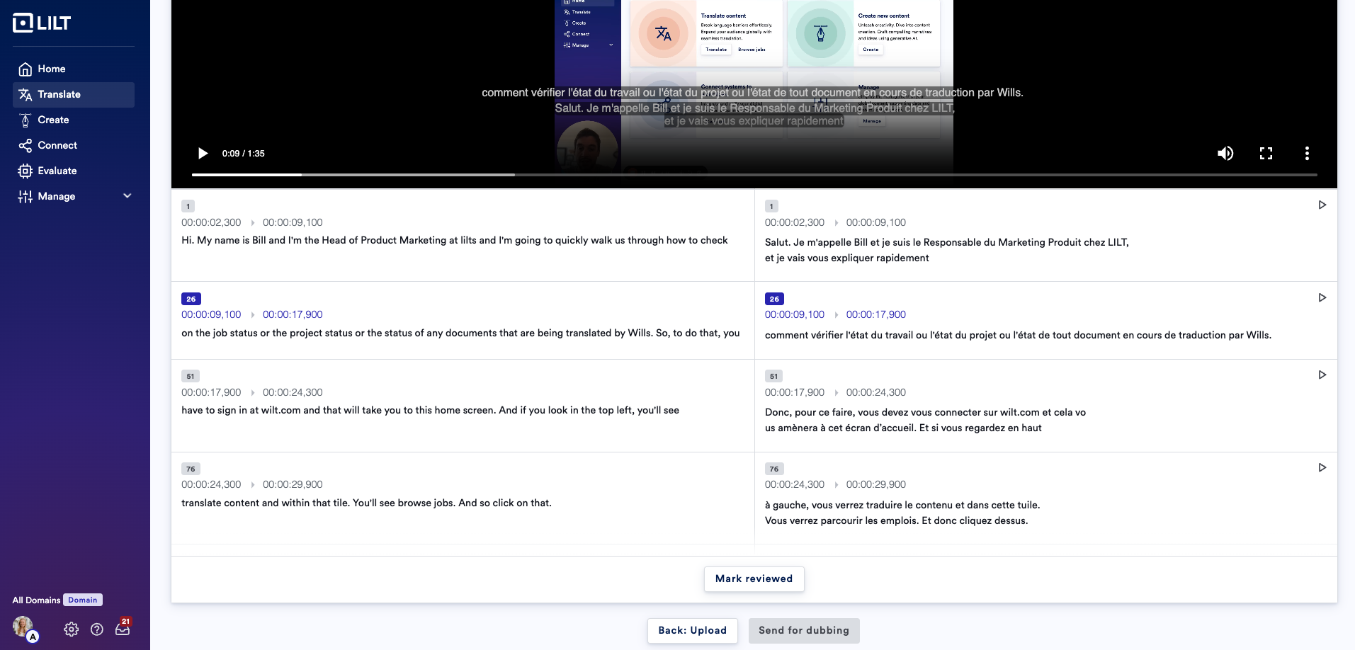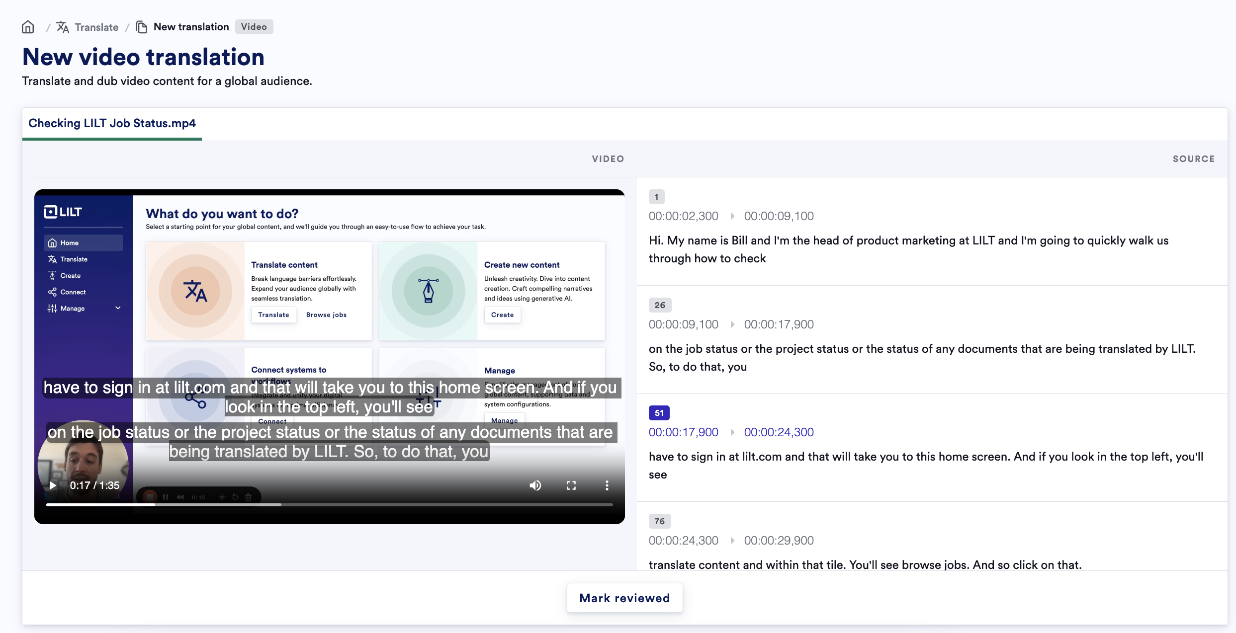 Review and make any necessary changes to the extracted text and timestamps. Once you’re satisfied with the source text, click on “Mark reviewed”. Click on “Translate” to instantly translate the content.