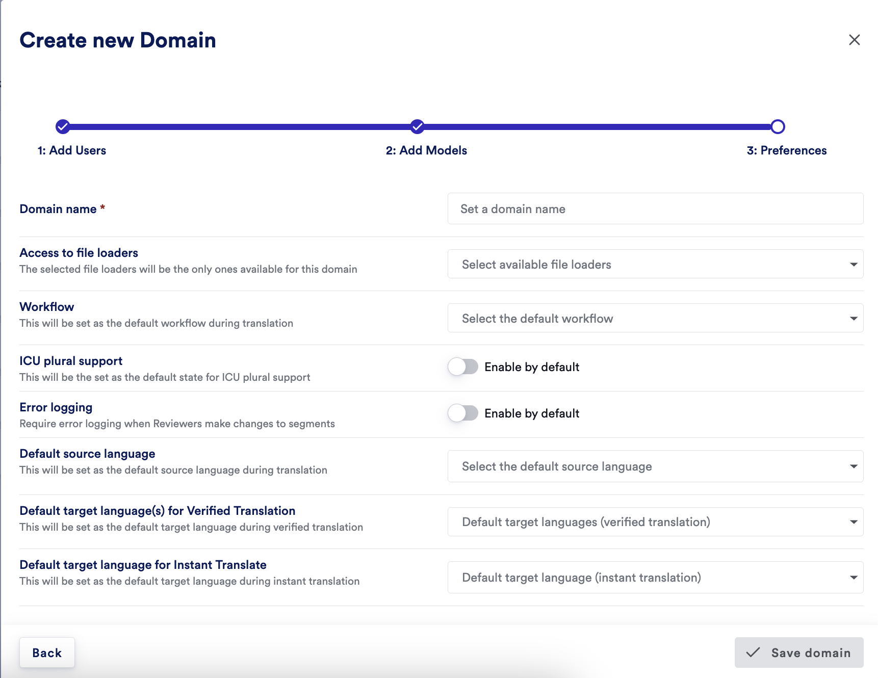 - You’ll be prompted to assign users, models, and preferences (such as file loaders and default languages) to the domain.