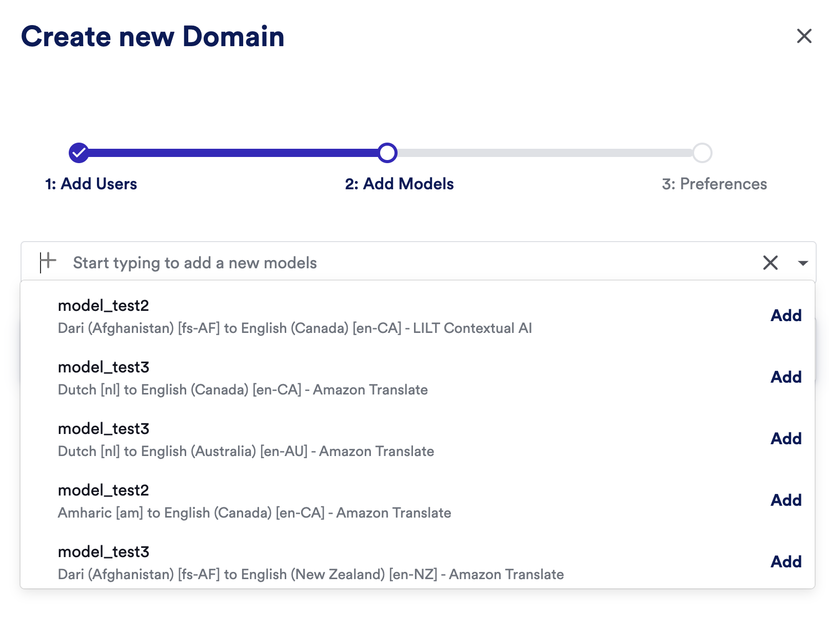 Choose the models available for the domain. Note: Your domain users will only be able to submit jobs for language pairs that have models assigned to the domain. For example, if you have a model assigned to a domain for enUS > frFR and a user tries to create a job for enUS > fr, your job creation will fail. You must have a model created for the domain to create jobs in that language pair.