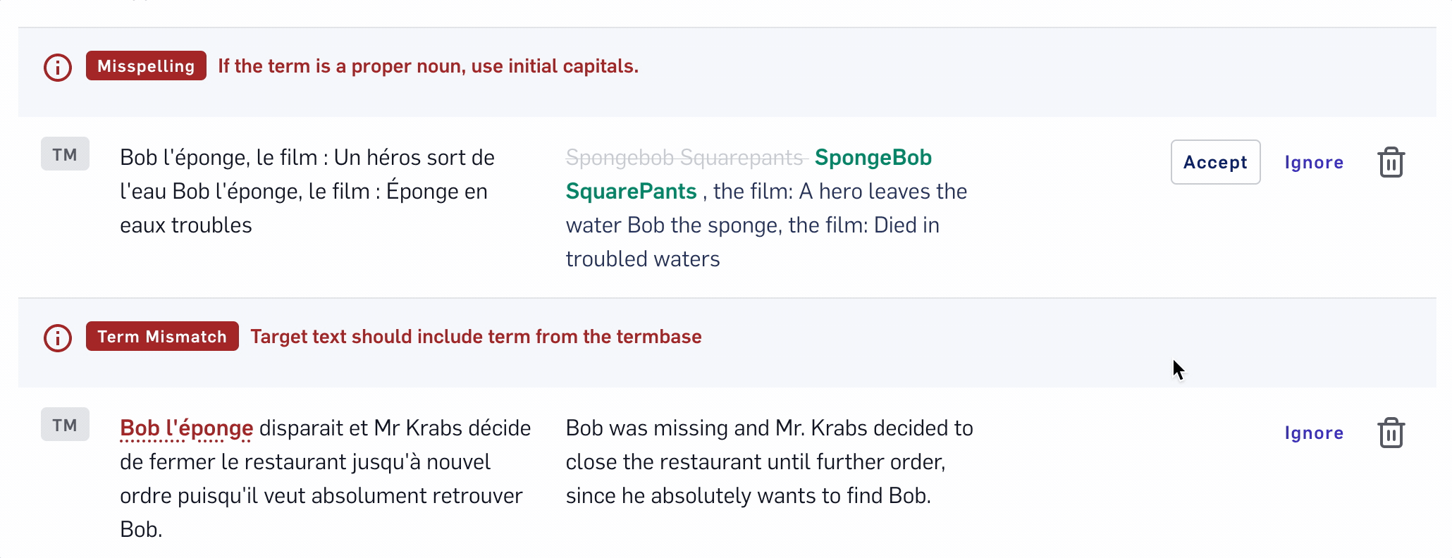 button to permanently ignore an entry. This is a useful option if you have determined there are no issues with the entry and want to continue leveraging the entry as-is for future translations. - Delete the TM entry: Click the trash icon to permanently remove the TM entry from the Data Source. This action cannot be undone and will ensure the entry is not leveraged in future translations.