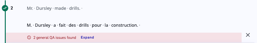 Batch QA displays segments with linguistic errors, and will often provide a suggestion to fix the error. You can accept these suggestions or click on the target text to make your own changes. QA errors can also beIgnored if you determine there is no error.