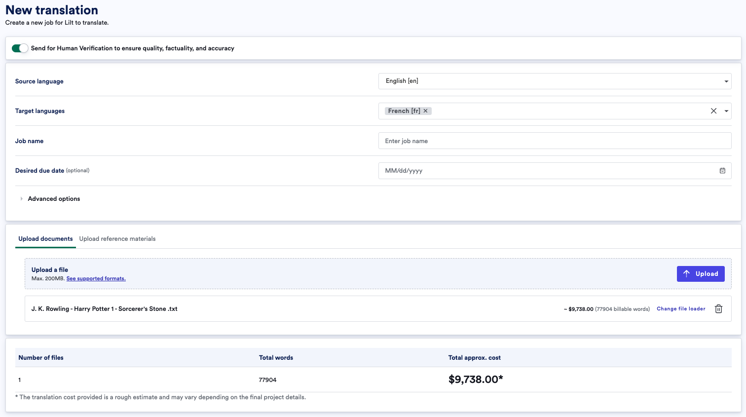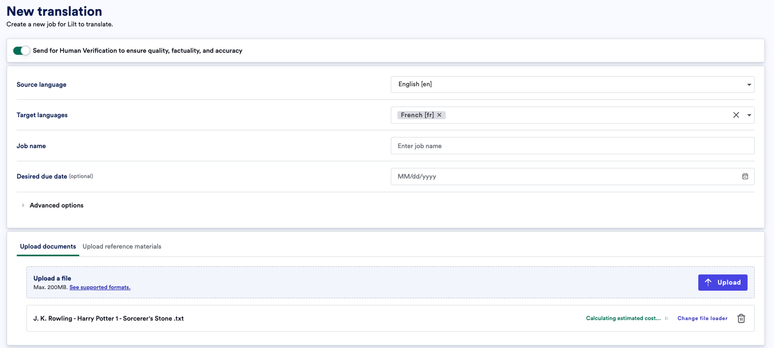 - Navigate to the new translation page: Go to the LILT platform and start a new translation job.