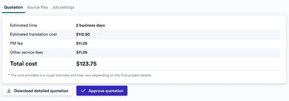 - Estimated costs: The translation cost provided is a rough estimate and may vary depending on the final project details. Changes in word count, file types, and translation complexity may affect the final billing.