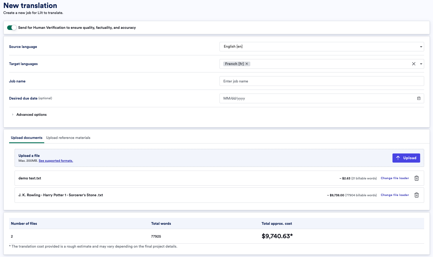 - Upload your files: Upload the files you want to translate. LILT supports multiple file types and formats. You can upload multiple files at once.