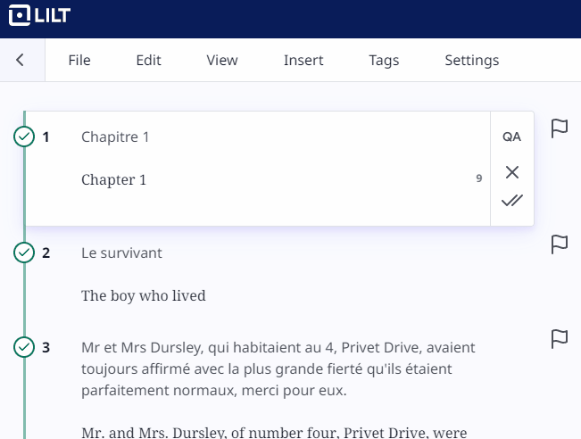 ) in the bottom-right of the segment to indicate that the segment has been reviewed. Once accepted, the segment can still be unaccepted and modified in Review mode, but can no longer be modified in Translate mode. Note: Segments do not have to be confirmed in Translate mode for reviewers to accept the segment in Review mode.