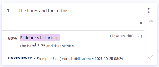 to close it. Once closed, you can still access and use the TM suggestion, but the TM diff display (including match percent) will go away. The diff display can be brought back by refreshing the page.