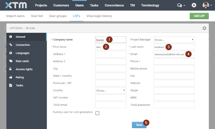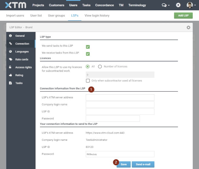 Users>LSPsand click theLILT LSPoption to open the LSP editor. Navigate toConnectionand fill inConnection information from the LSPfields using the information provided to the customer (via email) by XTM.