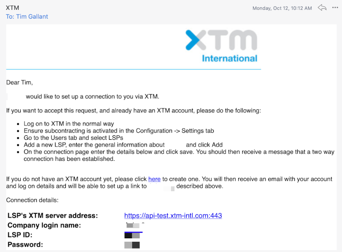 Adding LILT as an LSP within your XTM instance will trigger XTM to send an email to the address specified in the previous step. Once LILT has added the customer’s credentials (specified in the email) to LILT’s XTM instance, XTM will send an email back to the customer with instructions for how to complete the handshake process.